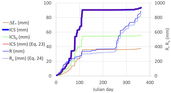 For the considered crop described in the previous section (Figure 10a,b), for CF = 1 and p = 0, and for the 2019 rainfall data series, interception and evaporation losses were calculated according to the described procedure. Figure 11 plots the detailed results of the involved cumulative water balance components, i.e., the rainfall depth, R (mm), the interception depth at the end of each wet spell, ICS, and the evaporation losses, . The latter made it possible to evaluate the antecedent stored volume before each WS, ICS0 = ICS − .