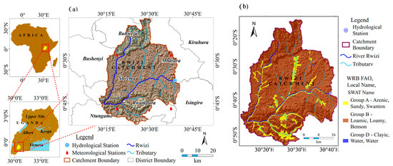 (a) Location and (b) soil information for the River Rwizi catchment.
