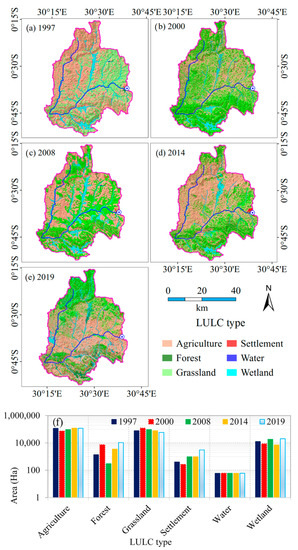 LULC (a–e) maps and (f) graphical summary for the River Rwizi catchment.