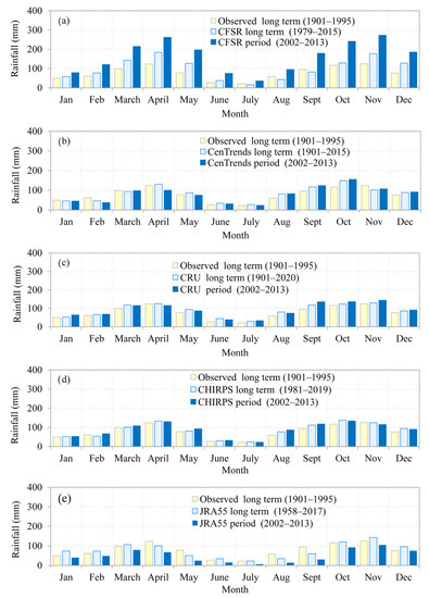 Monthly rainfall based on observed and (a) CFSR, (b) CenTrends, (c) CRU, (d) CHIRPS, and (e) JRA55 data.