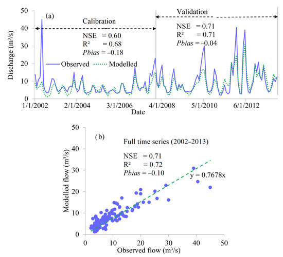 Calibration and validation were performed over the periods 2002–2008 and 2009–2013, respectively. Calibration and validation of SWAT was based on the LULC map for 1997. Evaluation of model performance during calibration and validation was performed both graphically and statistically. Graphically, plots of observed versus modeled series were made. Statistically, model performance was assessed using Nash–Sutcliffe Efficiency (NSE) [33], coefficient of determination (R2), and percentage of bias (Pbias) such that