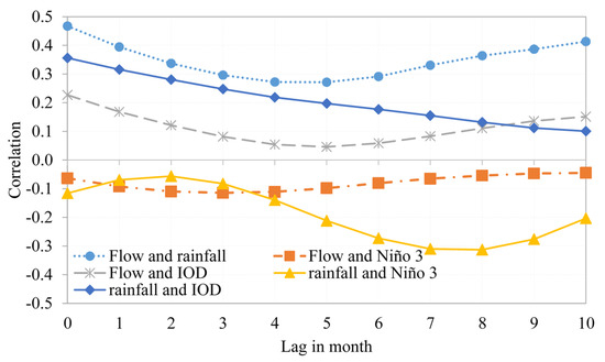 Insight on the linkage of variability of river flow and rainfall to the changes in large-scale ocean-atmosphere conditions was investigated using correlation analysis. Coefficients of correlation between river flow or catchment-wide averaged rainfall and two climate indices including Niño 3 index [41,42] and the IOD index were analyzed. The IOD index refers to the anomalous sea surface temperature (SST) difference between the western (50° E to 70° E and 10° S to 10° N) and the southeastern (90° E to 110° E and 10° S to 0° N) equatorial Indian Ocean. The Niño 3 refers to the SST across the tropical Pacific region (90°–150° W and 5° N–5° S). Before correlation analysis, seasonal components of the rainfall and river flow were removed. The steps to remove seasonality from the series involved [43] (a) extracting rainfall or flow for each month, (b) computing the long-term mean of the series extracted in (a) for each month, (c) taking the long-term monthly mean pattern as the seasonal model for each year of the data record, and (d) subtracting the long-term mean of a given month from the corresponding original data value.