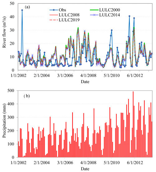 Monthly (a) observed (Obs) and simulated river flow based on different LULC maps, and (b) catchment-wide averaged rainfall.