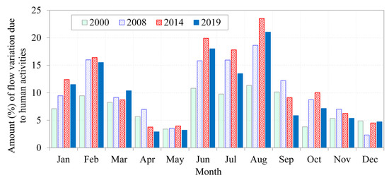 Generally, contributions of human activities to rainfall–runoff variation went up to 23.5% in August. For wet seasons (March–April–May, and October–November–December, amounts of contributions of human activities to river flow variation remained low. On average, the contributions from human activities to the monthly river flow variation over the periods 1997–2000, 1997–2008, 1997–2014, and 1997–2019 were 7.5%, 10.5%, 11.4%, and 9.9%, respectively.