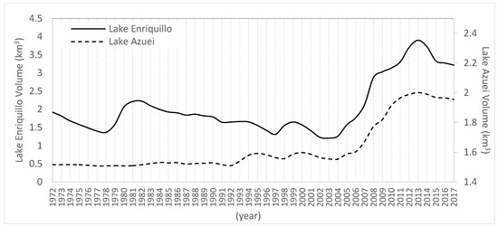 - Moknatian, M.; Piasecki, M. Lake Volume Data Analyses: A Deep Look into the Shrinking and Expansion Patterns of Lakes Azuei and Enriquillo, Hispaniola. Hydrology 2019, 7, 1. [Google Scholar] [CrossRef] [Green Version]