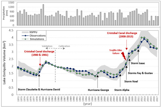 - During this period, four storms (Noel, 2007; Fay, 2008; Gustav, 2008; and Isaac, 2012) passed in the vicinity of the LE watershed, with precipitation higher than 100 mm/month and uncontrolled water from the Cristobal Canal flowing towards LE, causing it to rise seven more meters.In December 2007, Storm Noel passed close to the region, introducing water to LE from direct rainfall and runoff. In late 2007 and early 2008, the Trujillo Dike failed due to the Yaque del Sur flood, at which time most of the river flow began to drain indirectly into LE, first through the Trujillo Canal into Lake Rincon and then through the Cristobal Canal into LE. In 2008, Storms Fay and Gustav struck the lake in December, adding to its volume. In April 2011, Trujillo Dike was repaired; however, water leakage from the dyke did not entirely stop. In 2012, another storm passed through, and LE expanded due to the extra volume originating from rainfall and runoff. These additions, however, did not account for all the LE growth, pointing to the existence of the continued extra flows in the Cristobal Canal. Without Cristobal’s contributions, the lake might have risen by only 2.5 m between 2007 and 2013.Based on water budget estimations, 0.24 km3/yr of added volume to the lake came from the Cristobal Canal’s discharge. The contributions of other factors were 0.37 km3/yr due to evaporation, 0.23 km3/yr as direct rainfall, 0.19 km3/yr accumulated runoff, and 0.03 km3/yr via groundwater contributions.The noticeable deviation between simulated and actual time-series for 2012–2014 was attributed to the assumption of a constant value for evaporation and discharge.