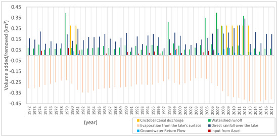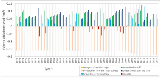 - During this period, LA exhibited a stable behavior, and the amount of inflow and outflow to/from the lake was balanced. Average volumes estimated in this period were: 0.16 km3/yr due to evaporation, 0.08 km3/yr as direct rainfall, 0.07 km3/yr from runoff, 0.02 km3/yr via groundwater return flow, and 0.01 km3/yr as outgoing seepage from Azuei.