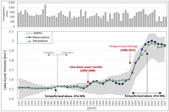 - The shrinkage pattern observed for this period was due to the absence of storm activity and inter-basin water transfer. Therefore, the water budget of the lake system was dominated by evaporation (~0.29 km3/yr), causing it to shrink. Based on water budget estimations, the volume gathered by direct rainfall over the lake (~0.15 km3/yr) was higher than the volume received from surface runoff (~0.07 km3/yr).Differences between simulations and observations (1987–1996) could be due to assumptions taken and simplifications made during the modeling phase, such as the inclusion of constant evaporation and the choice of storm events. In 1988 and 1993, two storm incidents (Chris and Cindy) were reported with less than 87 mm of monthly rain, which may have slightly offset the graphs. Due to the lack of detailed data, the decision was made to carry on with the initial constraint that only storms occurring in months with a rainfall rate of more than 87 mm/month (within 80 km striking distance) [29] should be considered for the simulations.