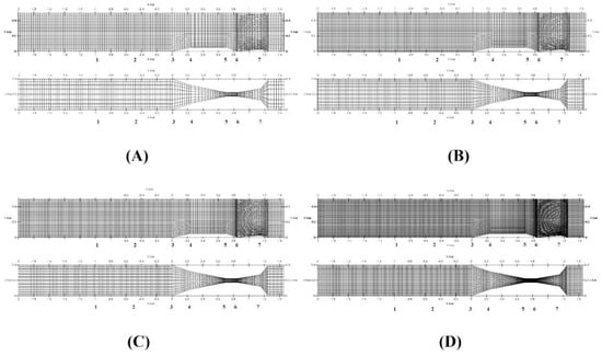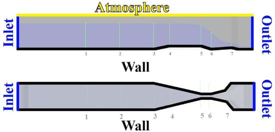 Figure 7, the flow’s pressure field gradient was the lowest when the flow achieved a higher speed from cross-sections 5 to 7. Due to the presence of the throat contraction, a higher pressure was present downstream over the entire flow up to the start of the throat section.