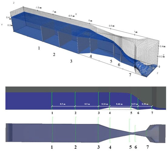 Figure 3 illustrates the geometry and dimensions of the Parshall flume used in the simulation. Water enters the main channel, which has a width of 40 cm, i.e., cross-sections 1 and 2, and, with the help of wing walls, it gradually enters the throat section, which has a 5-cm wall-to-wall distance. The length of the throat, i.e., the distance between cross-sections 5 and 6, is 15 cm. Finally, the flow passes the divergence section, where the slope of the bed gradually becomes positive after cross-section 6.