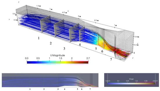 Figure 6, the maximum speeds were 0.97, 1.21, and 2.45 m/s, respectively, from cross-sections 5 to 7. Due to the shape of the flume, the distribution of the velocity profiles was varied in shape, e.g., at cross-section 5 it was distributed evenly, but as the flow moves forward, the velocity concentration shifted toward the center of the cross-section. The diverging shape of section 7 is the reason that the velocity distribution was concentrated at the sides and not the center.