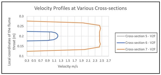 The velocity profiles at cross-sections 5, 6, and 7 are presented in
