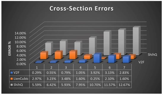 Figure 9, the average error values for the different cross-sections increased rapidly compared to the other two models. The maximum error value is recorded when the mean value of the error percentages for the seven different cross-sections is calculated.