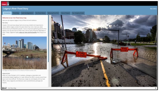 https://maps.calgary.ca/RiverFlooding/ (accessed on 1 September 2021), which contains images, text, flood maps, and testimonies from flood victims. This application allows users to look up their individual address and see if they are within the floodway zone. Furthermore, story maps can be used in climate change studies to communicate potential flooding impacts [