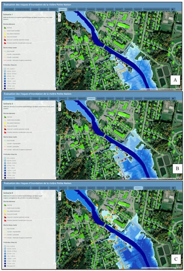 Table 3. These maps were generated by combining the flood hazard maps with population vulnerability maps. The flood hazard was obtained through the HAND method and composed of the raster files (water depth grids) associated with different discharges. The estimated discharge values for the Petite-Nation River watershed correspond to the discharge flow at the hydrometric station located in Ripon. Threshold discharge values are defined by Quebec’s Ministère de la Sécurité Publique (department of public security). The flood hazard maps are mainly composed of the raster files (water depth grids). These files were gradually transformed into a format suitable for ArcGIS Online (feature or image service) and included in the story map. The population vulnerability was based on the vector of the flood exposure and the flooded road network, generated by the module vulnerability of population of GARI tool. The combination of the hazard and vulnerability allowed a complete and relevant estimate of the flood risk to be obtained. The flood risk maps were estimated and mapped for each residential building present in the study.