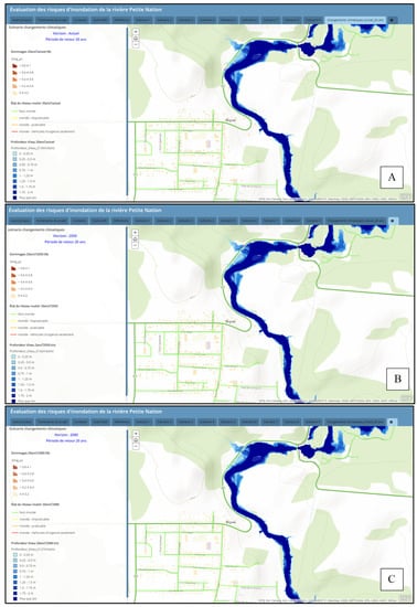 Table 4. The projections are based on the estimated development for 2050 and 2080. Present and future flood hazard and vulnerability will help stakeholders better understand the potential impact of climate change on flood risk in the Petite-Nation River watershed. These climate change maps were created for the two most populated municipalities of the Petite-Nation River watershed (Ripon and St-Andre-Avellin) and included projected flood hazard and monetary damage layers for the baseline, 2050 and 2080 horizons. The monetary damage was estimated using the GARI software (damage to buildings and infrastructure module).