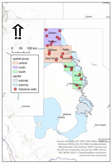 Figure 1. Each spatial grouping has at least one well sampling location that is a Dockum well and one that is Ogallala. (Note these groupings are different from the historical analysis groupings which covered a much larger area.) All groupings have at least two wells for each aquifer in the group except for the west group, which only has one well for each aquifer. These groups are used for Dockum and Ogallala box plot comparisons on different aggregate water quality parameters as given in
