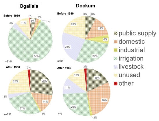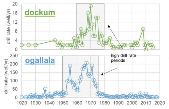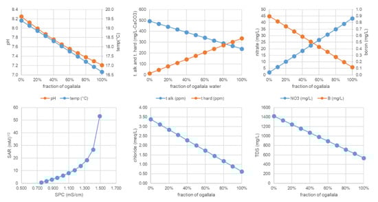 Figure 11d,e where the interquartile range for each of these five constituents in the Ogallala wells is fairly small. For example, in panel (d) it can be seen that the IQR for
