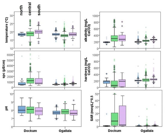 Figure 8 reveals that total hardness is one of the biggest areas of difference in the two aquifers within each spatial group. With the exception of the north spatial group, the hardness seems much lower in the Dockum compared to Ogallala water with Dockum-to-Ogallala ratios of 0.04–0.30 (Ogallala 3–25× harder than Dockum). Contrastingly, in the north group, the ratio is 1.72 (Dockum water harder than Ogallala). Looking at the absolute level of hardness, in general many Dockum waters are relatively soft, having total hardness < 90 mg/L as CaCO