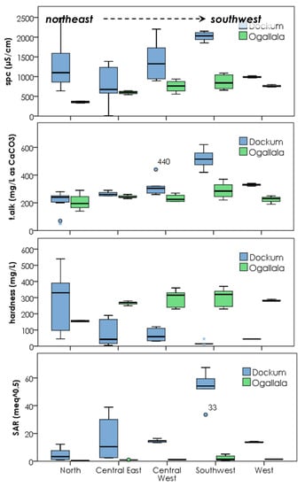 Examining each water quality parameter in turn, we find differences between Ogallala and Dockum waters within the same group, differences in the same aquifer but in different spatial groups, and spatial trends in the way in which common location Ogallala and Dockum waters differ from each other. For SPC overall values, the trend is that SPC is higher in Dockum waters as compared to Ogallala waters within each spatial group. The higher TDS is in agreement with the overall trend in higher salinity for Dockum waters. However, the degree of the difference is certainly different. The ratio of mean values of Dockum TDS to Ogallala TDS within the same spatial group ranges from 1.3 to 3.4 with the highest value being in the north and the lowest in the west. The north, while it has the highest SPC multiple relative to Ogallala water, it is not the highest absolute difference. The greatest absolute increase in SPC is in the southwest region, where SPC is on average 1150 μS/cm (750 mg/L TDS equivalent) higher in Dockum groundwater as compared to Ogallala.