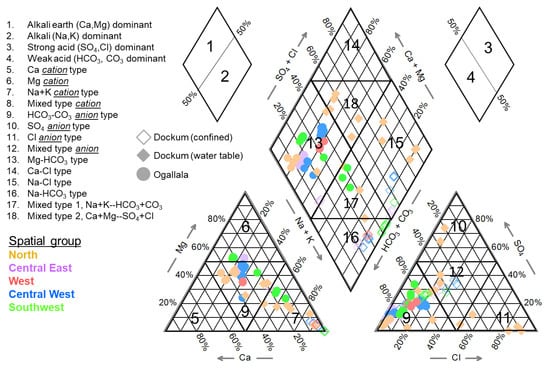 We now examine Dockum and Ogallala waters at the more detailed level—the results of individual water constituents. We first used Piper diagrams to classify aquifer waters in hydrochemical facies (