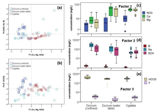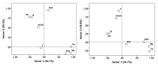 . A general interpretation of these factors, by their constituents is as follows. F1 represents the influence of multivalent cations and nitrate, while at the same time deemphasizing sodium and boron. F2 represents the collective influence of sulfate, sodium, boron, and to a lesser degree bicarbonate. Additionally, F3 is strongly indicative of fluoride’s influence with some co-influence of bicarbonate.