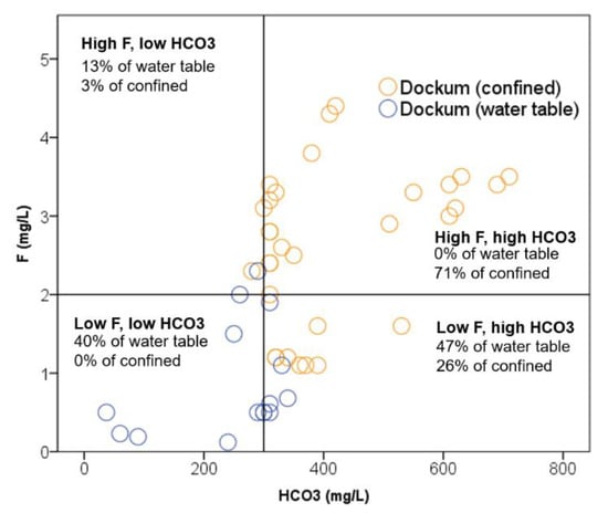 Figure 12 illustrates the differentiation in both Dockum confined and water table groundwater. In the figure, we have divided the space of fluoride and bicarbonate results into four quadrants with thresholds of above or below 2 mg/L F