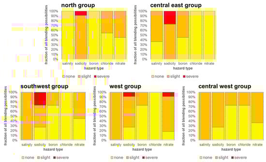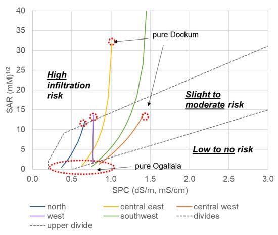Generally, SAR is higher in all of the spatial groups for Dockum waters over Ogallala with the increase ranging from 10 to 24× higher in the Dockum. The large increase might not be as much of an issue if there were not so many SAR values > 9. However, out of all Dockum samples 66% were at SAR 9 or greater. A few samples in the central east were lower than this, and all of the north group samples had SAR < 9. For Ogallala samples, 89% had SAR < 2, and the maximum value was only 5.1. The southwest group stands out as having very high SAR at 56 ± 7.1 (mean ± 95% conf). There is no possibility of this water being safely used for any type of irrigation without substantial treatment or modification. The risk to soil structure and soil health is too great.