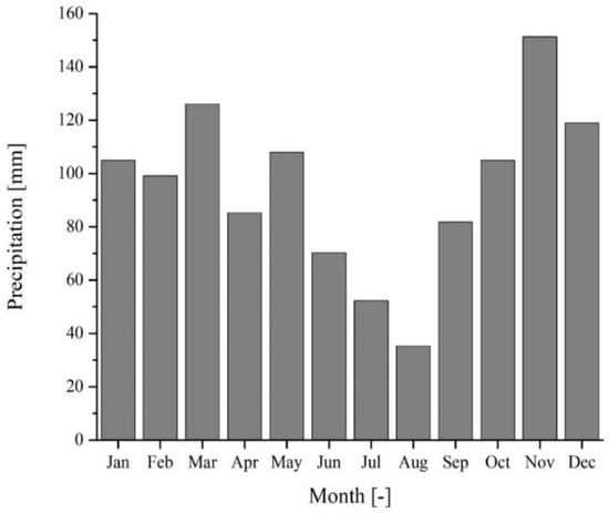With specific reference to the Rieti province, the annual precipitation ranges from 1200 to 1600 mm, with October, November, and December being the rainiest months [27]. Rainfall has two maxima, the main one in autumn and the second in late spring [28]. The summer aridity period is limited to the months of July and August [27]. Figure 2 confirms the descripted monthly trend. The winter season generally lasts 140 days, covering part of spring [28]. Snow falls generally on hills and mountains, rarely on the valley where it is instead possible to have some foggy days, especially during spring and autumn.