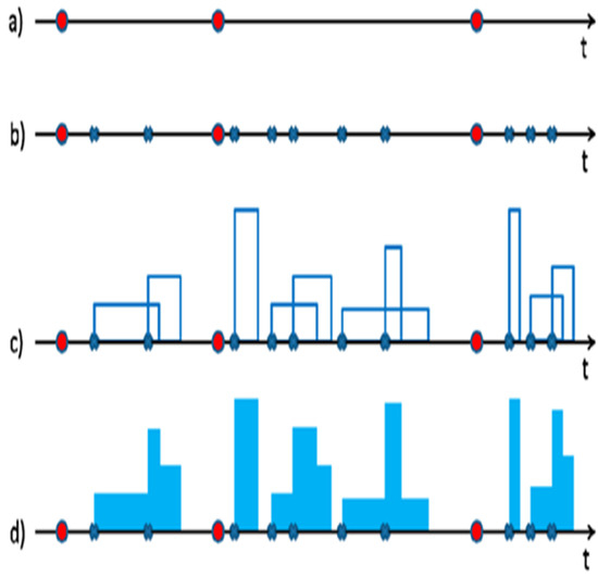 Figure 3. Representation of the (NSRP) stochastic process for at-site rainfall modeling (from [43]): (a) occurrences of storms; (b) for each storm, determination of the number of pulses and their temporal occurrences; (c) estimation of intensity and duration for all the pulses; (d) calculus of total intensity at time t.