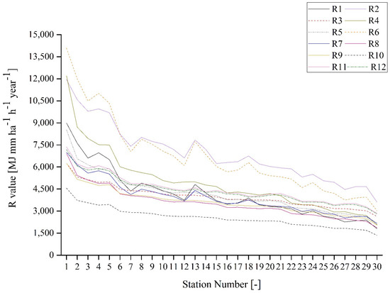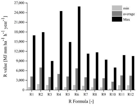 Even if the average and minimum values are similar, we can observe strong differences between all the formulas in the maximum rainfall erosivity values. Here the difference of the values can vary from about 8000 MJ * mm * ha−1 * h−1 * year−1, that is the lowest maximum value (R10), to more than 24,000 MJ * mm * ha−1 * h−1 * year−1 for R4 and R6 formulas.