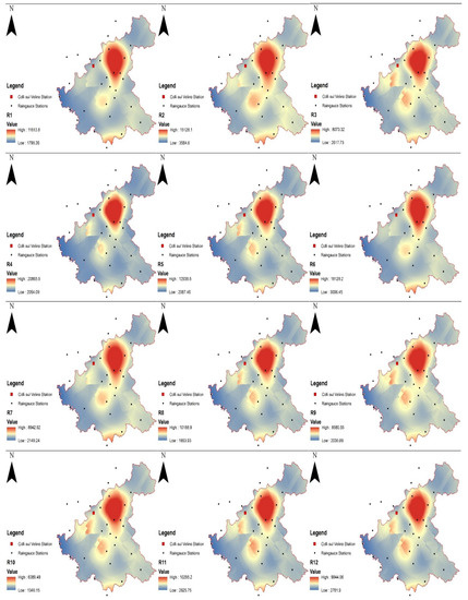 Figure 5. Rainfall erosivity maps created using the 12 equations. All the values are expressed in MJ * mm * ha−1 * h−1 * year−1.