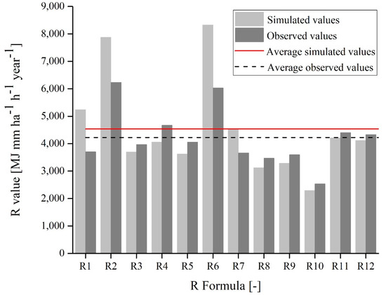 Figure 8. Rainfall erosivity value obtained with the 12 investigated equations, respectively, with simulated and observed rainfall data set. The red line represents the average of 12 values obtained considering the synthetically generated rainfall data, while the black dashed line represents the average of 12 values obtained considering the observed data.