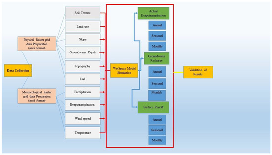 WetSpass-M [15] is an ArcGIS-integrated model used to simulate runoff, groundwater recharge, interception, and evapotranspiration. WetSpass-M model is available for free download from https://github.com/WetSpass. Basic input data for this model include meteorological data (rainfall, potential evapotranspiration, wind speed, and temperature), topography, land use/land cover, soil texture, groundwater depth, and leaf area index [15,28]. All input data were prepared in Geographic Information (GIS) in Ascii grid format, and the cell size of all raster maps was kept equal for running the model. ArcGIS 10.3.1 was used to prepare the input data from the year 2000 to 2019 and the raster cell size was kept at 100 m × 100 m. The total grids of each parameter were 72713. WetSpass operates on the principle of water balance. The scheme of the WetSpass-M model is shown in Figure 2.