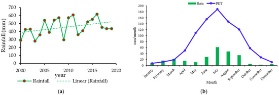 Figure 5. (a) Long-term average annual rainfall (2000–2019) and (b) long-term average monthly rainfall and potential evapotranspiration (2000–2019).