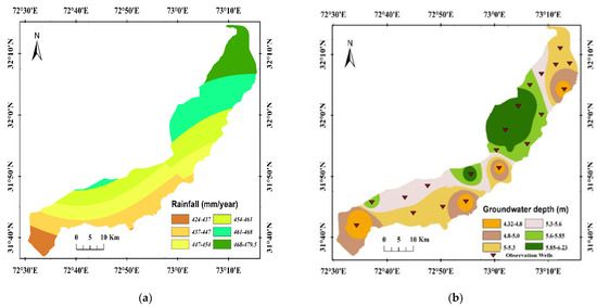 The long-term monthly rainfall varied from 35.9 mm to 40.5 mm with an average value of 38.5 mm/month, and the minimum rain was observed in November and the maximum rainfall in July, as shown in Figure 5b. The long-term annual rainfall had a minimum value of 424 mm, a maximum value of 679.5 mm, and an average value of 455.7 mm/year (Figure 5a and Figure 6a). Daily groundwater depth data were collected from the Punjab Irrigation Department for the period from 2000 to 2019. The spatial groundwater depth was constructed using Kriging interpolation. The average groundwater depth ranged from 4.39 m to 6.2 m, as shown in Figure 6b.