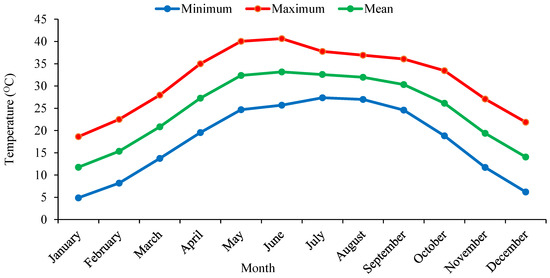 where PET is the potential evapotranspiration (mm day−1); Tmean Tmax, and Tmin are average, maximum, and minimum temperatures (°C), respectively; and Ra is the extraterrestrial radiation (mm day−1). The average monthly PET is presented in Figure 5b. It ranges from 7 mm to 189 mm with an average of 75.4 mm. The lowest PET occurs in January, 7mm, while July has the highest, 189 mm (Figure 5b). A graphical representation of long-term maximum, minimum, and mean monthly temperature is depicted in Figure 7. The average monthly temperature between 2000 and 2019 of the Khadir canal sub-division ranged from 11.3 °C in January to 33.1 °C in June as the minimum and maximum values, respectively, with an average temperature of 24.5 °C. The highest temperature of 40.1 °C was recorded in June, while January had the lowest temperature of 4.8 °C. Table 1 shows the input data and their sources for the WetSpass-M model.