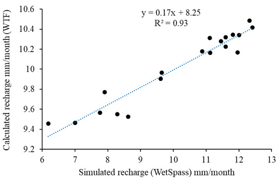 Validated results showed a good agreement between the simulated groundwater recharge by WetSpass and the calculated recharge by WTF with R2 = 0.93., a mean error of 0.18 mm/month, an absolute mean error of 1.49 mm/month, and a root-mean-square error (RMSE) of 0.34 mm/month, as shown in Figure 8.