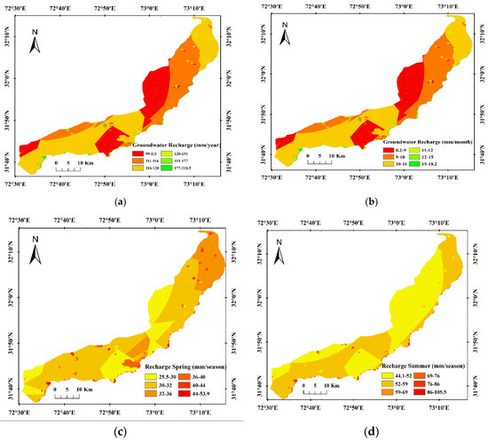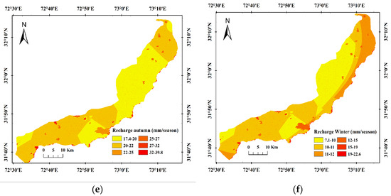 Long-term summer groundwater recharge ranged from 44.1 mm/season to 105.6 mm/season with a mean value of 114.5 mm/season and a standard deviation of 4.5 mm/season (Figure 11d.) Long-term autumn groundwater recharge varied with a minimum value of 17.4 mm/season and a maximum value of 39.8 mm/season with mean and standard deviation of 20.7 mm/season and 1.9 mm/season, respectively (Figure 11e). Long-term groundwater recharge in winter for the period of 2000 to 2019 has a maximum value of 22.7 mm/season and minimum value of 7.1 mm/season with an average value of 10.5 mm/season and a standard deviation of 1.3 mm/season (Figure 11f). Long-term groundwater recharge values of spring ranged between 25.6 mm/season and 53.9 mm/season, having an average value of 8.9 mm/season and a standard deviation of 2.2 mm/season (Figure 11c). Results showed that 51% groundwater recharge occurred in summer, 18% in autumn, 14% in winter, and 17% in spring. Similarly, long-term monthly groundwater recharge ranged between 8.3 mm/month and 18.2 mm/month as minimum and maximum values, respectively, with a standard deviation of 0.8 mm/month and an average value of 9.8 mm/month (Figure 11b).