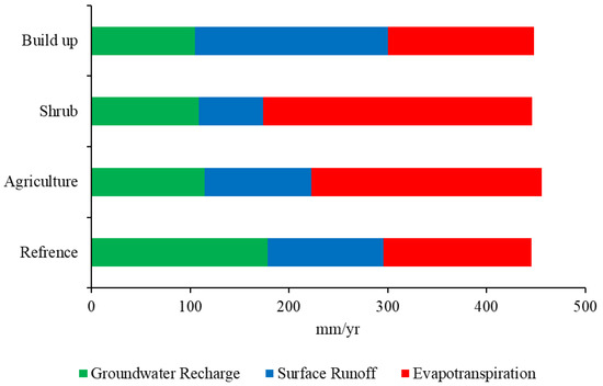 Assessment of the water balance components, especially recharge, with respect to land-use/land-cover change is important for proper groundwater management. Land use/land cover directly affects the water balance components of evapotranspiration, recharge, and runoff [36,37], and the relationship between land use and land cover was assessed in this study. In built-up areas, long-term annual surface runoff was greater as compared to evapotranspiration and groundwater recharge, as shown in Figure 12. Evapotranspiration in the built-up area was 32.7%, recharge was 23.7%, and runoff was 43.6 % of the total precipitation, as shown in Appendix A Table A1. In the shrubs area, there was more evapotranspiration than recharge and surface runoff, as evapotranspiration in the shrubs-covered area was 59%, runoff 16.3%, and recharge was only 24.7% of the total precipitation. In agricultural areas, simulated evapotranspiration was 51.1%, surface runoff 23.3%, and recharge 25.3% of the total precipitation on a long-term annual basis. In the reference (grass) area, recharge was observed to be maximum as compared to evapotranspiration and runoff. There was 40% recharge, 26.5% runoff, and 33.5% evapotranspiration of the total precipitation, as shown in Table A1.