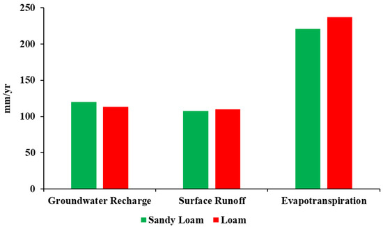 The relationship between water balance components and soil texture was important for groundwater management. The study area was divided into two major classes, sandy loam and loam. Groundwater balance components behaved differently in different soil types. In sandy loam soil, more recharge was simulated by the model than in loamy soil, but evapotranspiration and surface runoff in sandy loam were more than in loamy soil, as shown in Figure 13.