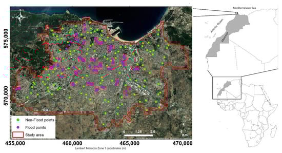 In this study, a flood inventory map between 2018 and 2021 was prepared based on several sources of information (Figure 1), particularly from available documents and reports (historical flood database) obtained from the Tangier City Authority and multiple field surveys. We also used information on flooding events published on social media (Facebook and Tweeter). This latter approach, called “social media crowdsourcing”, is an additional and novel source of data that has proven to be effective and complementary for the rapid assessment of natural hazards and for providing information on user-observed damage levels and their geospatial location [23,24,25,26,27,28,29]. A total of 126 points were identified as flood locations, while 126 non-flooded points were randomly chosen in non-flooded zones. In order to develop the urban flood vulnerability map, flooded and non-flooded areas were assigned a code of 1 and 0, respectively.