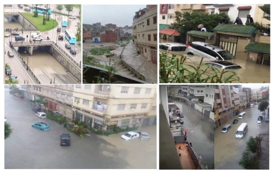 In recent years, Tangier city has been affected by several floods, which have caused extensive damage to the city and its infrastructure. The most recent and perhaps the most devastating flood the city has experienced was on 8 February 2021, where 28 people have died after torrential rains. Most of the victims were women who were working in an illegal underground textile factory, located in the basement of a house. This incident highlighted the impact of uncontrolled socio-economic and urban development in one of the country’s economic hubs on the increase in areas at high risk of flooding. Flood images from 2018 to 2021 in different parts of the city are presented in Figure 2.