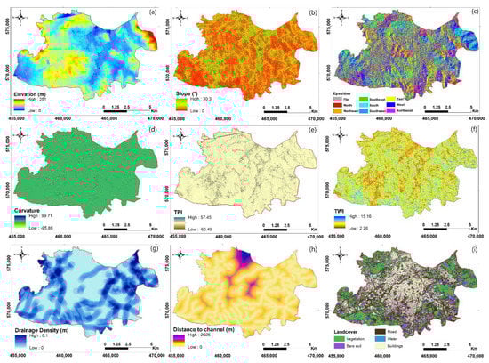 Map of the geo-environmental factors of the study area: (a) elevation; (b) slope; (c) exposition; (d) curvature; (e) TPI; (f) TWI; (g) drainage density; (h) distance from channel; (i) land cover.