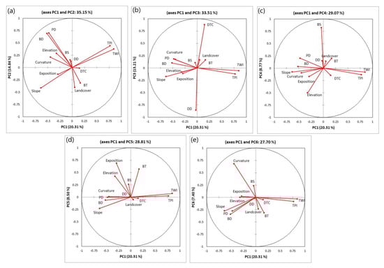Distribution of parameters on (a) PC1 and PC2 axes, (b) PC1 and PC3 axes, (c) PC1 and PC4 axes, (d) PC1 and PC5 axes, and (e) PC1 and PC6 axes.