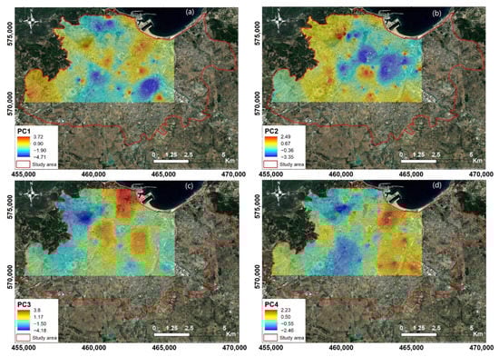 Principal components furnish the macro-parameters, i.e., synthetic data that convey strong and significant information and, therefore, are particularly suitable and relevant for time monitoring or digital mapping and spatial analysis, just like original parameters [39]. However, it should be noted that the mapping of the sources of variability does not cover the entire study area, since the limit of the interpolation is given by the coverage of the identified flood points.