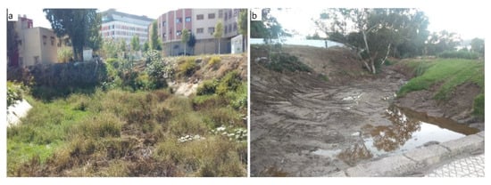 (a) Drainage channel not maintained or cleaned, (b) and drainage channel maintained and cleaned before the start of the rainy season (September 2021) in the city of Tangier.