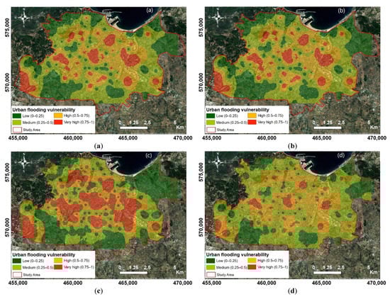 Urban flooding vulnerability map obtained from (a) linear discriminant analysis (LDA); (b) logistic regression (LR); (c) classification and regression tree (CART); (d) Support vector machine (SVM).