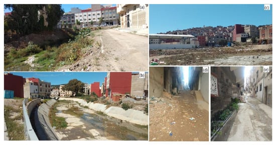 Example of areas in Tangier city identified by all four models as being at very-high vulnerability of flooding: (a,b) associated with short distance to the channel, high drainage density and recent buildings; (c–e) associated with steep slopes, high density of old buildings and high population density.