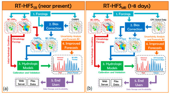 Structure and major modules required to implement an operational Realtime Hydrologic Forecasting System (RT-HFS) at (a) short-range timescales RT-HFSSR and at (b) medium-range timescales RT-HFSMR.